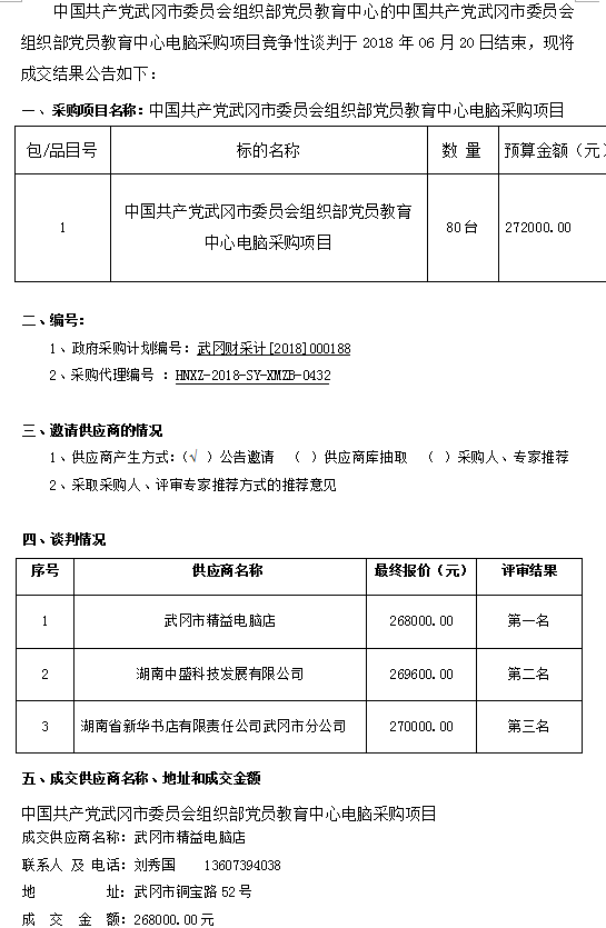 中國共產黨武岡市委員會組織部黨員教育中心電腦采購項目 競爭性談判成交結果公告