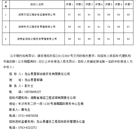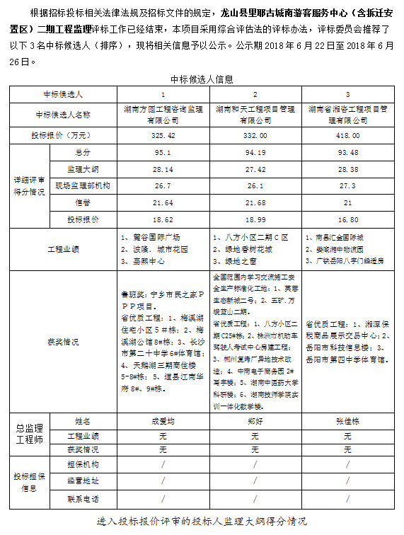 龍山縣里耶古城南游客服務中心(含拆遷安置區)二期工程監理 招標投標信息公示表