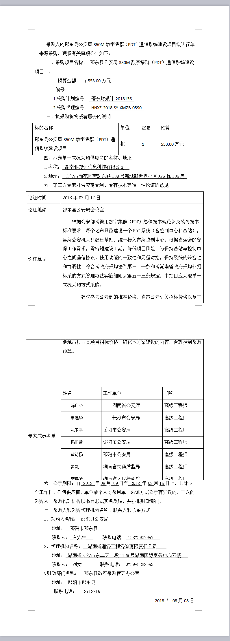 邵東縣公安局350M數字集群(PDT)通信系統建設項目 單一來源采購公示