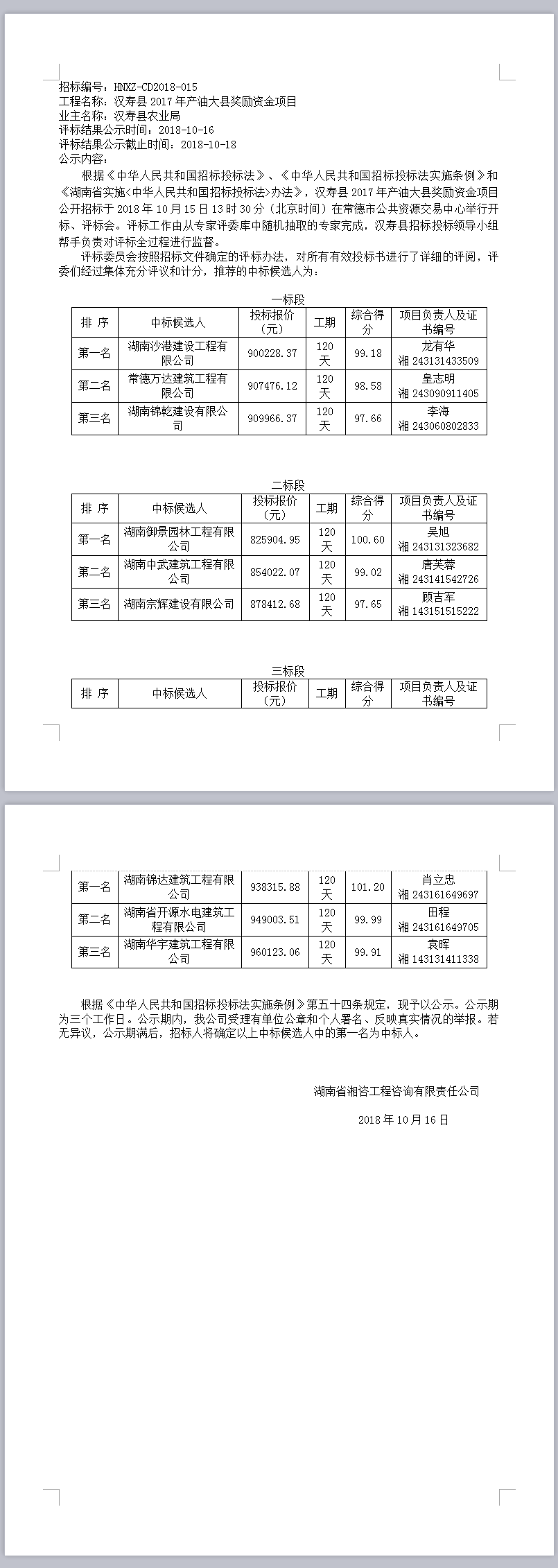 漢壽縣2017年產(chǎn)油大縣獎勵資金項目中標(biāo)候選人公示