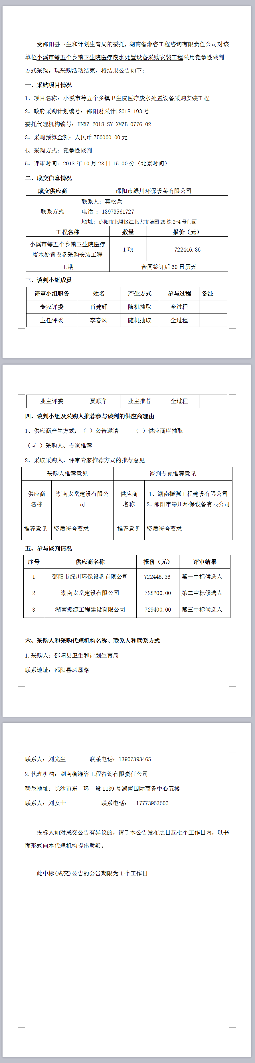 小溪市等五個鄉鎮衛生院醫療廢水處置設備采購安裝工程談判成交公告
