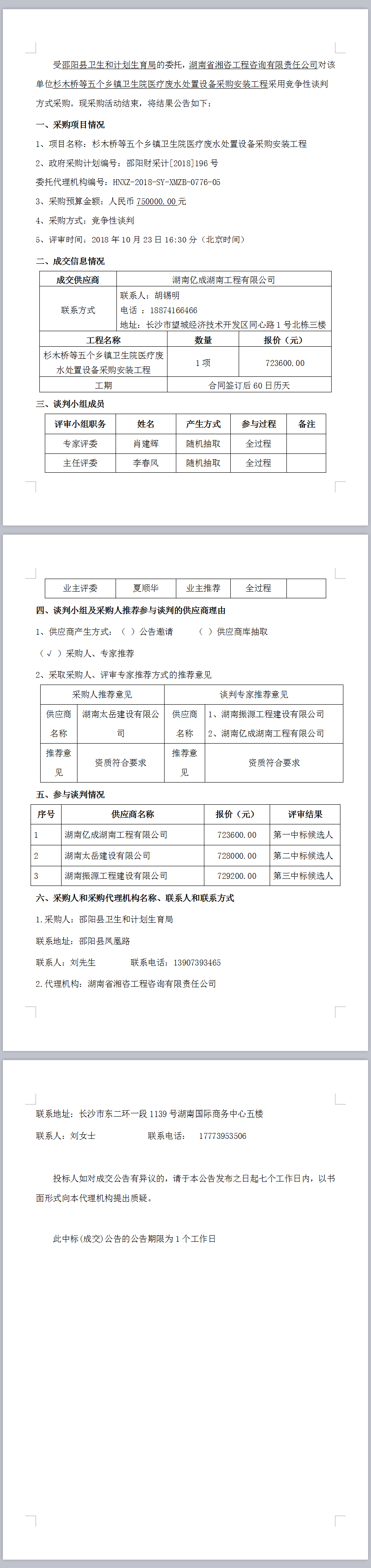 杉木橋等五個鄉(xiāng)鎮(zhèn)衛(wèi)生院醫(yī)療廢水處置設備采購安裝工程談判成交公告