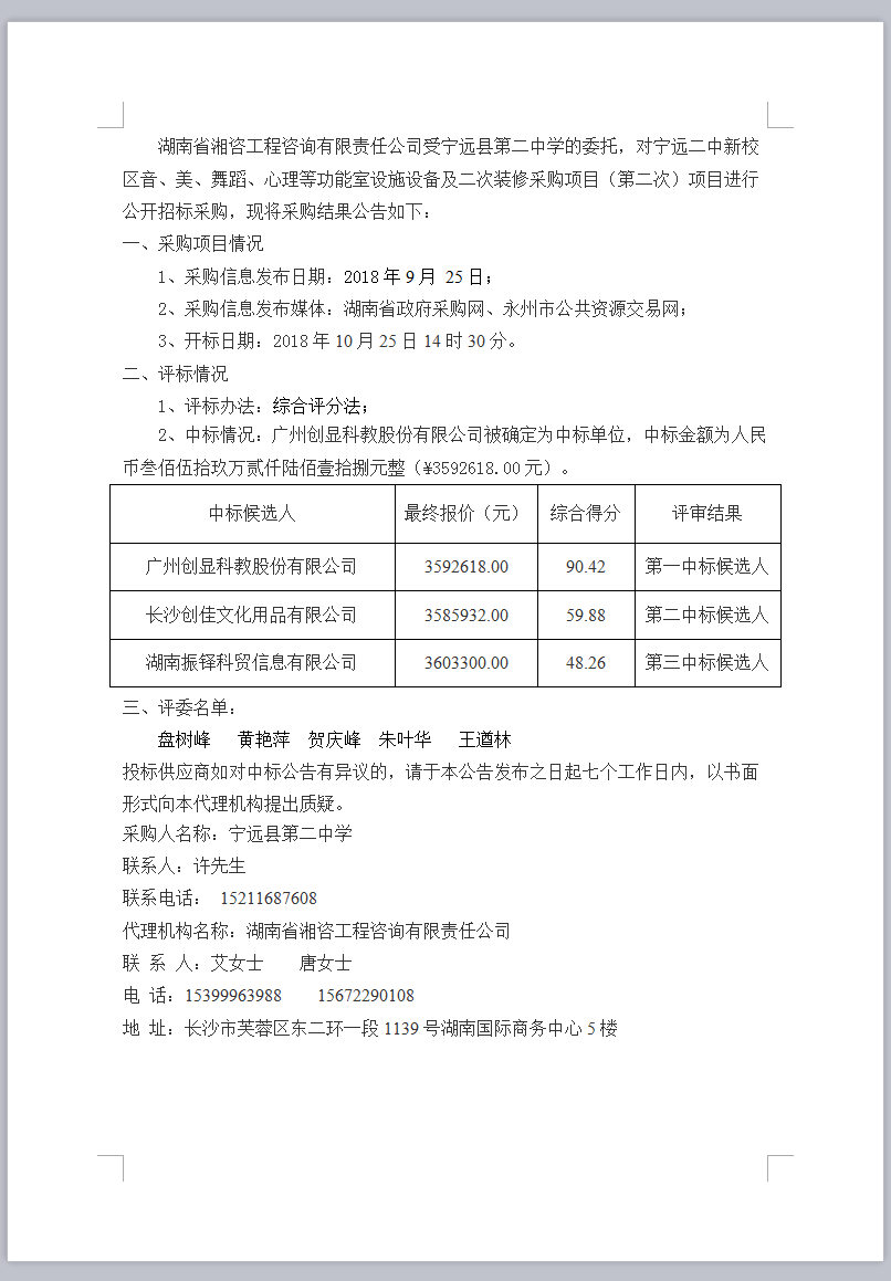 寧遠二中新校區音、美、舞蹈、心理等功能室設施設備及二次裝修采購項目中標公告