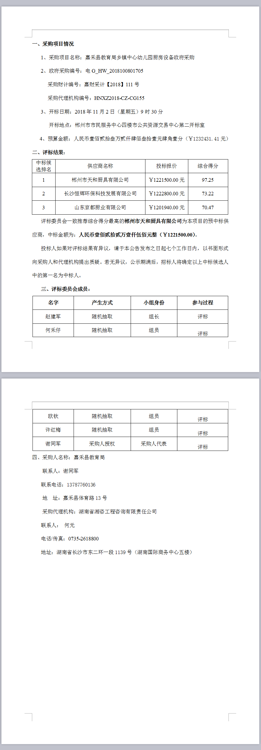 嘉禾縣教育局鄉鎮中心幼兒園廚房設備政府采購中標結果公示