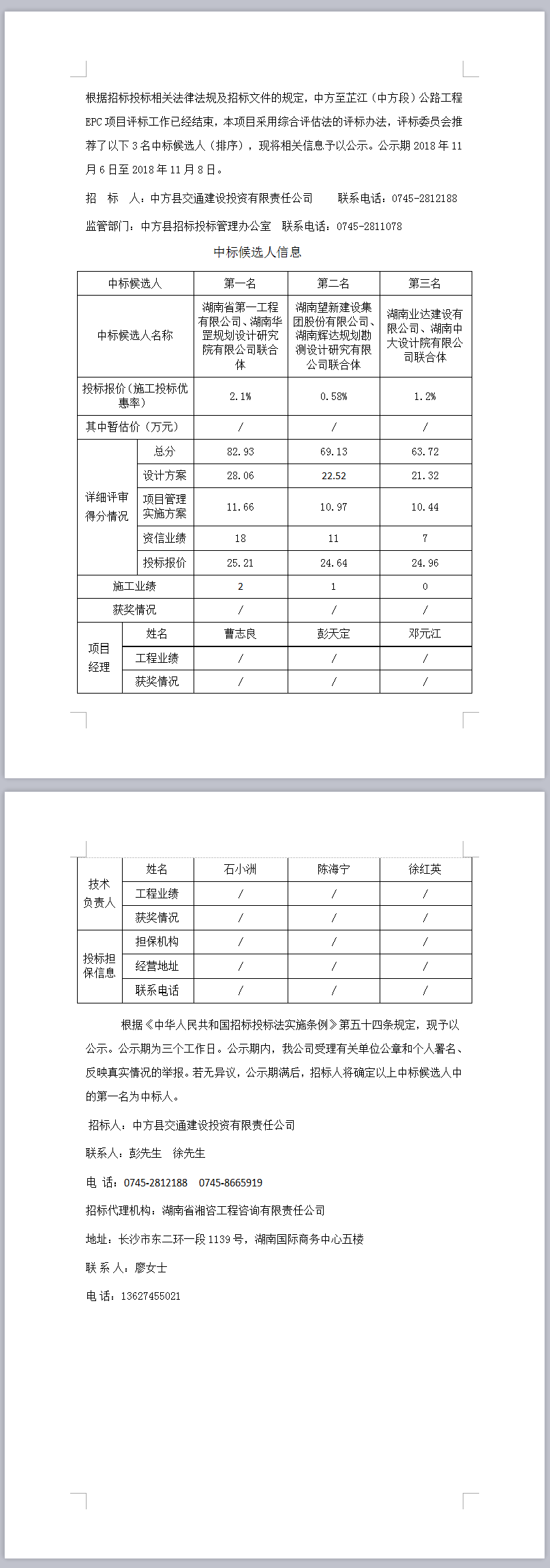 中方至芷江(中方段)公路工程EPC項目中標候選人公示