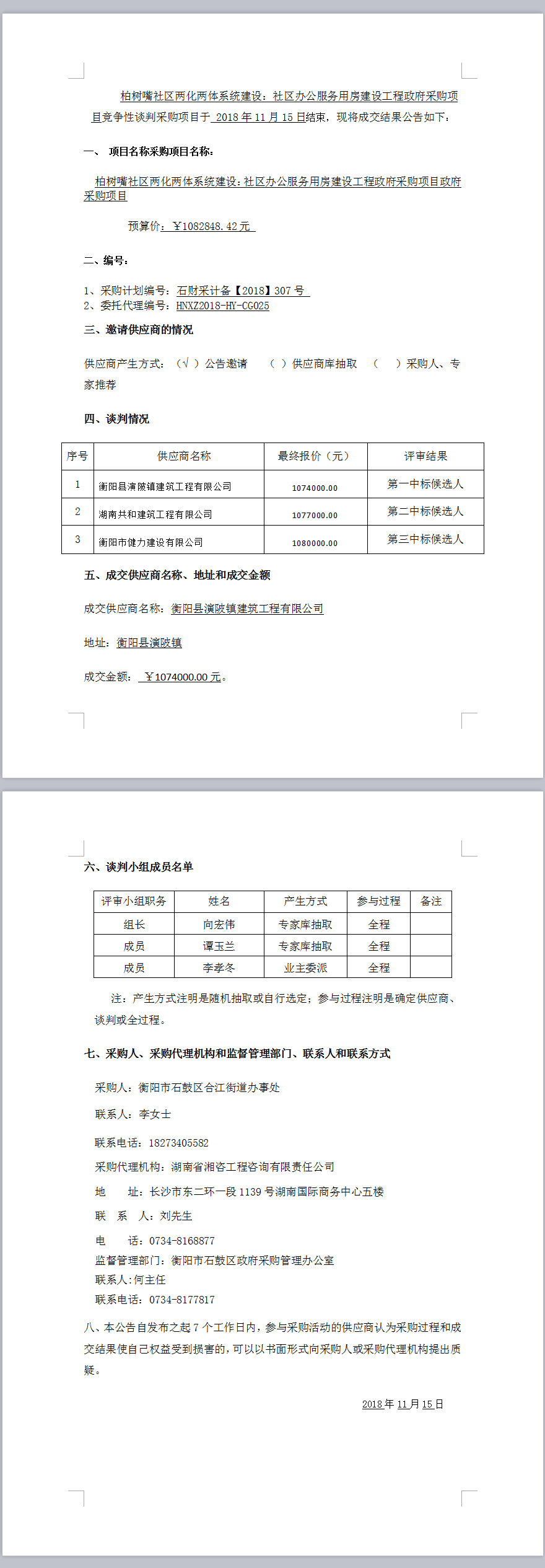 柏樹嘴社區兩化兩體系統建設:社區辦公服務用房建設工程政府 采購項目談判成交公告