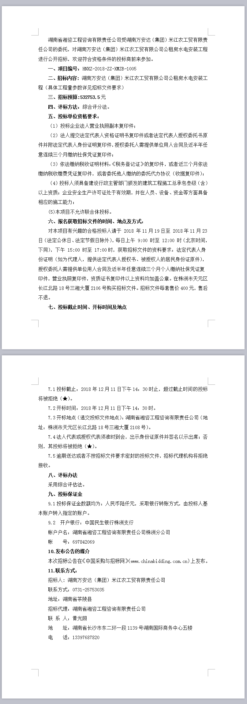 湖南萬安達(集團)米江農工貿有限公司公租房水電安裝工程招標公告