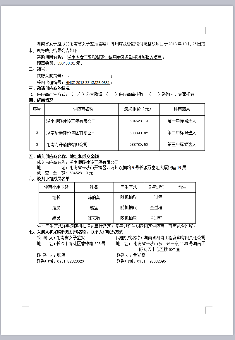 湖南省女子監獄警察訓練用房及備勤樓消防整改項目成交結果公告