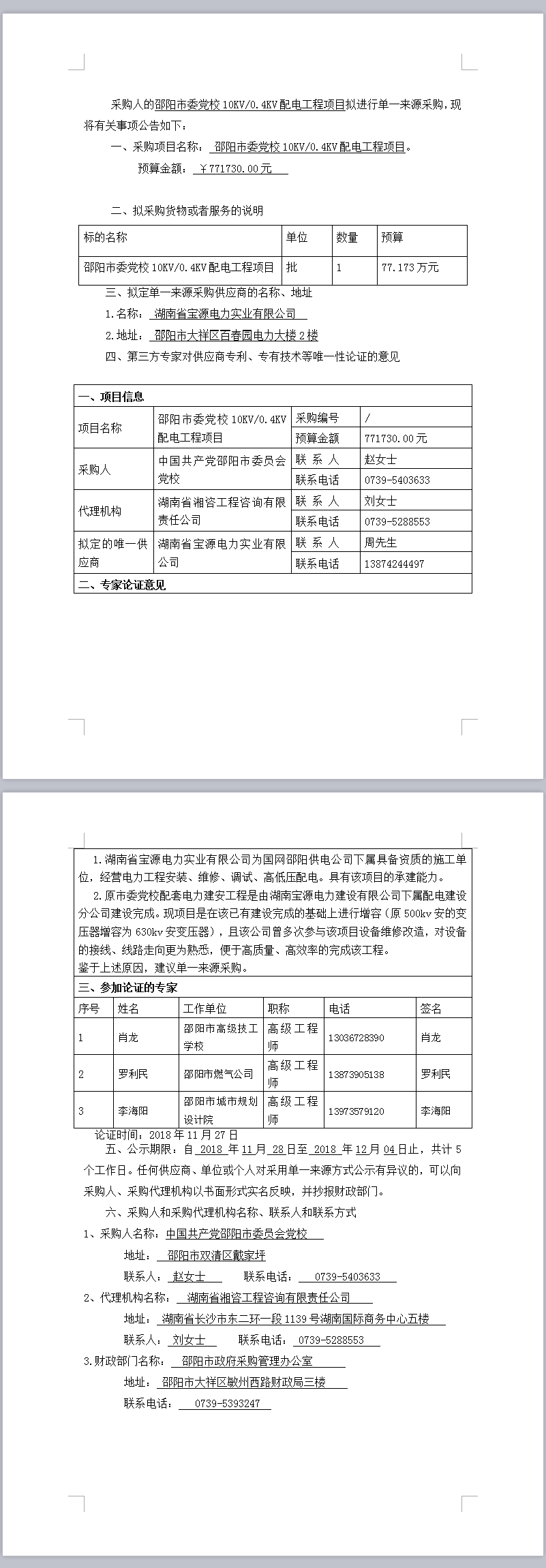 邵陽市委黨校10KV/0.4KV配電工程項(xiàng)目單一來源論證公示