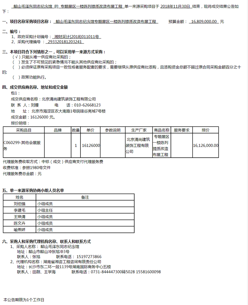 韶山毛澤東同志紀念館專題展區一樓陳列提質改造布展工程單一來源采購成交公告