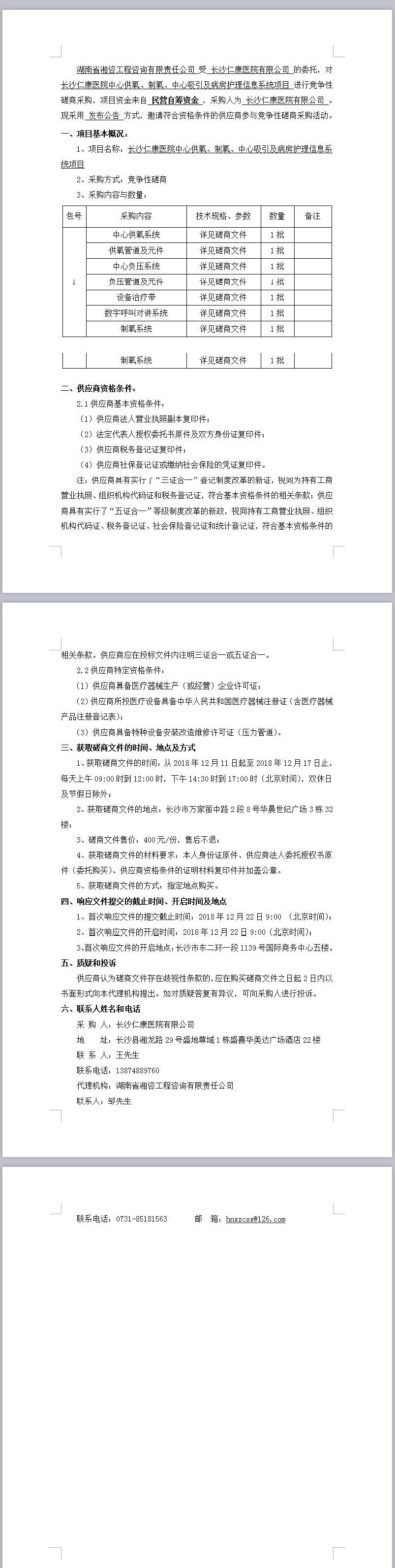 長(zhǎng)沙仁康醫(yī)院中心供氧、制氧、中心吸引及病房護(hù)理信息系統(tǒng)項(xiàng)目磋商邀請(qǐng)公告