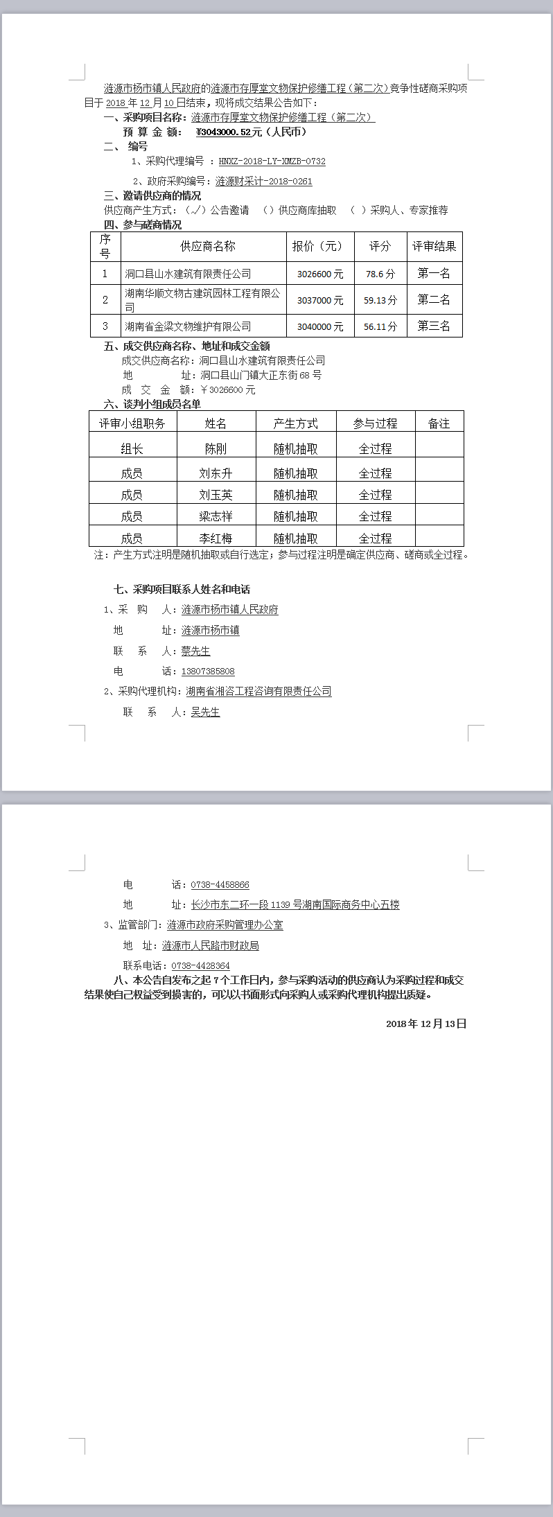 漣源市存厚堂文物保護修繕工程(第二次) 競爭性磋商成交結果公告