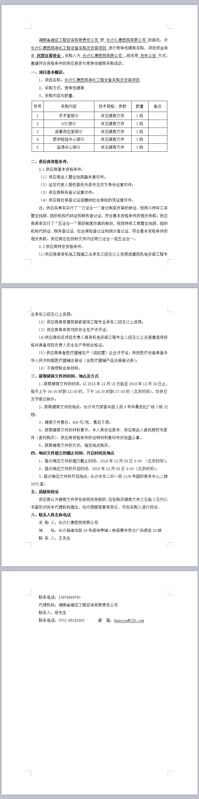 長沙仁康醫(yī)院凈化工程設(shè)備采購及安裝項目磋商邀請公告