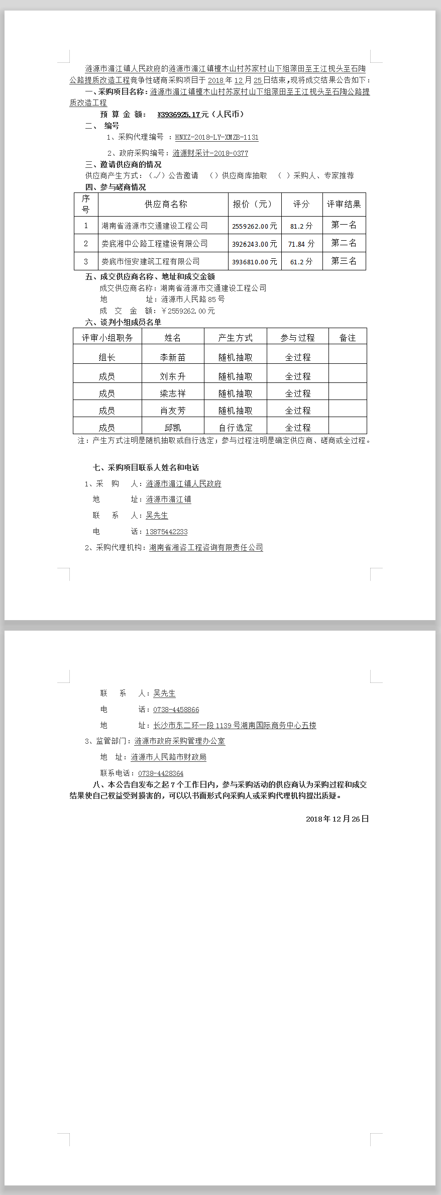 漣源市湄江鎮(zhèn)檀木山村蘇家村山下組蒎田至王江枧頭至石陶公路提質(zhì)改造工程競爭性磋商成交結(jié)果公告