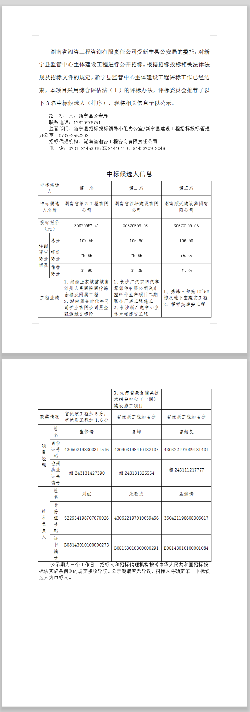 新寧縣監管中心主體建設工程招標投標信息公示表