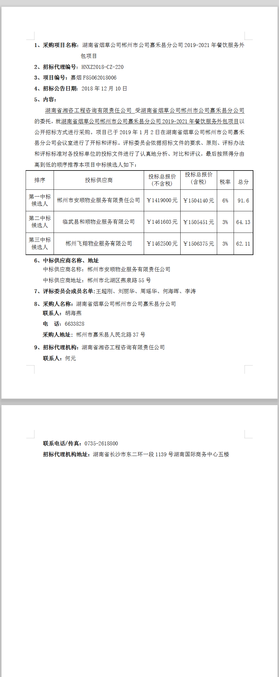 湖南省煙草公司郴州市公司嘉禾縣分公司2019-2021年餐飲服務外包項目中標公告