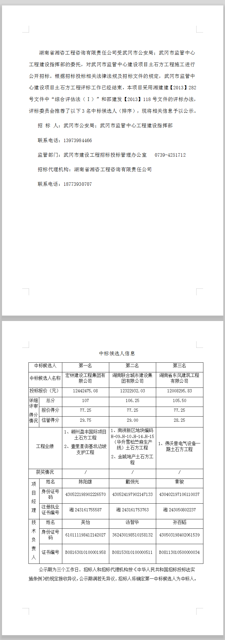 武岡市監管中心建設項目土石方工程施工中標候選人公示