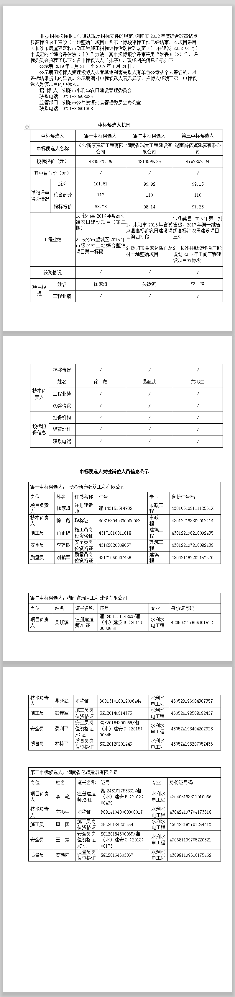瀏陽市2018年度綜合改革試點縣高標準農田建設(土地整治)項目D包第七標段 中標候選人公示
