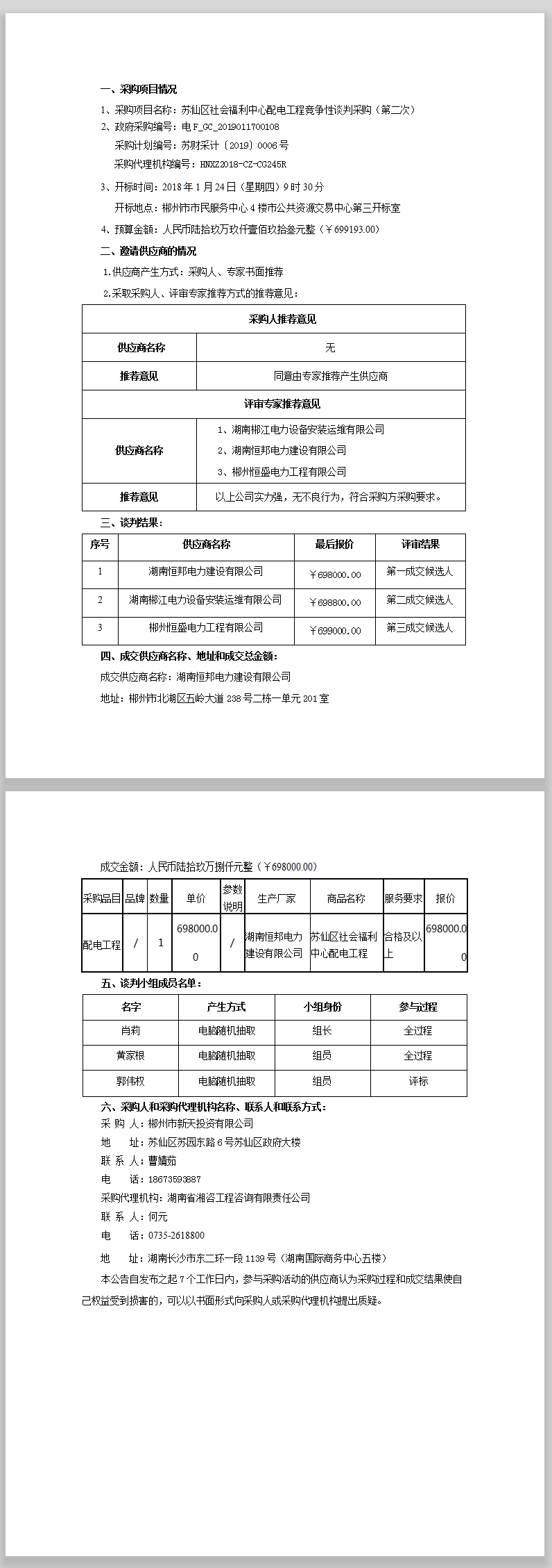 蘇仙區社會福利中心配電工程競爭性談判采購(第二次)成交公告