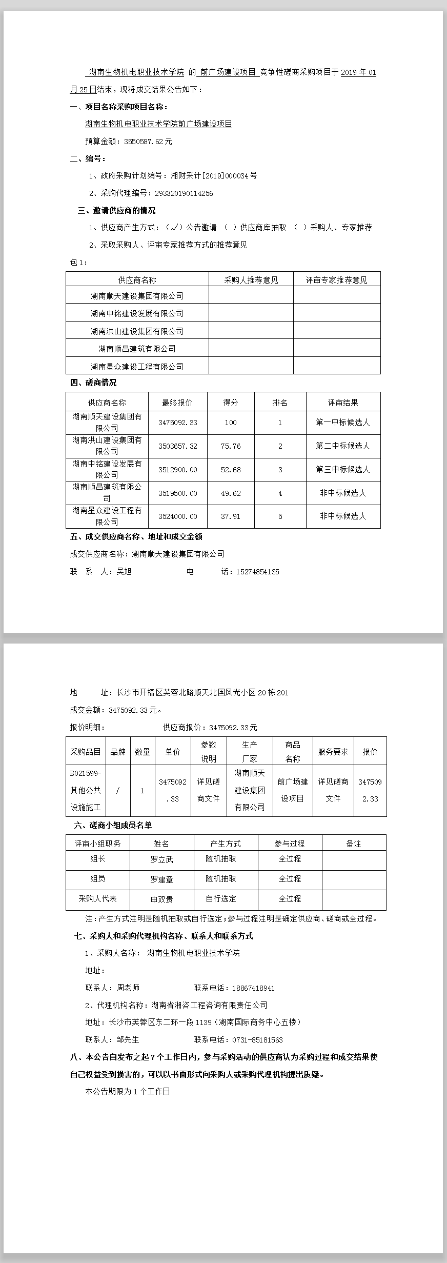 湖南生物機電職業技術學院前廣場建設項目競爭性磋商成交公告