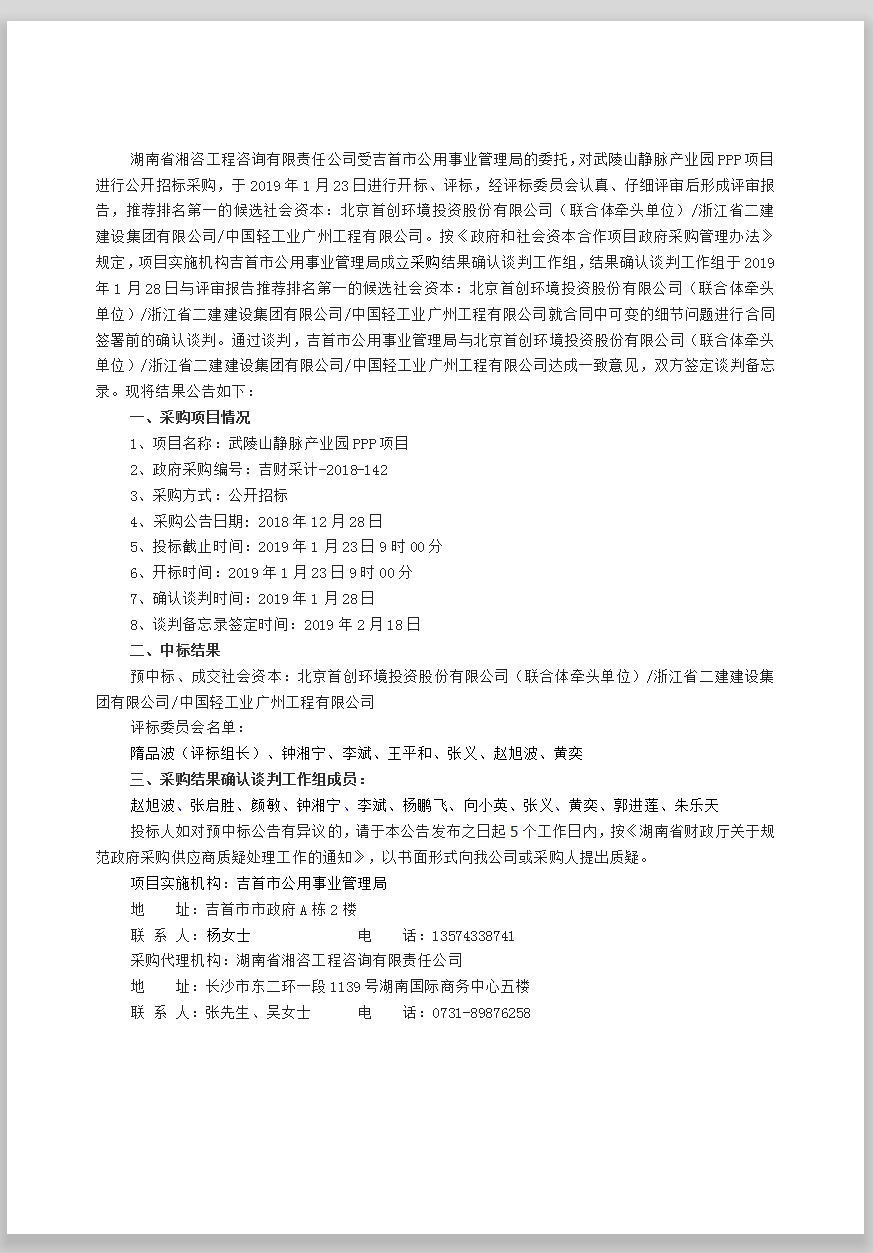 武陵山靜脈產(chǎn)業(yè)園PPP項目預中標結(jié)果公示
