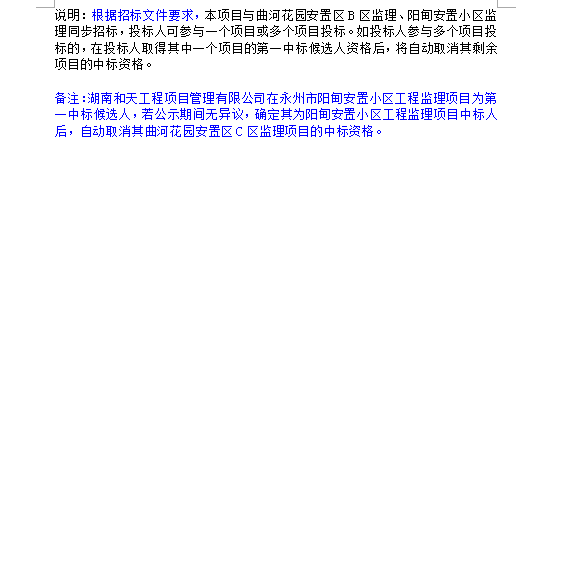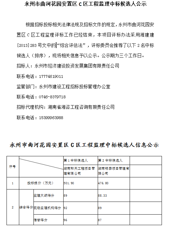 永州市曲河花園安置區(qū)C區(qū)工程監(jiān)理中標候選人公示