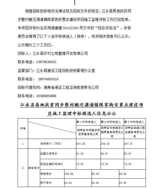 江永縣易地扶貧同步整村搬遷瀟浦鎮(zhèn)陳家街安置點建設項目施工監(jiān)理中標候選人公示