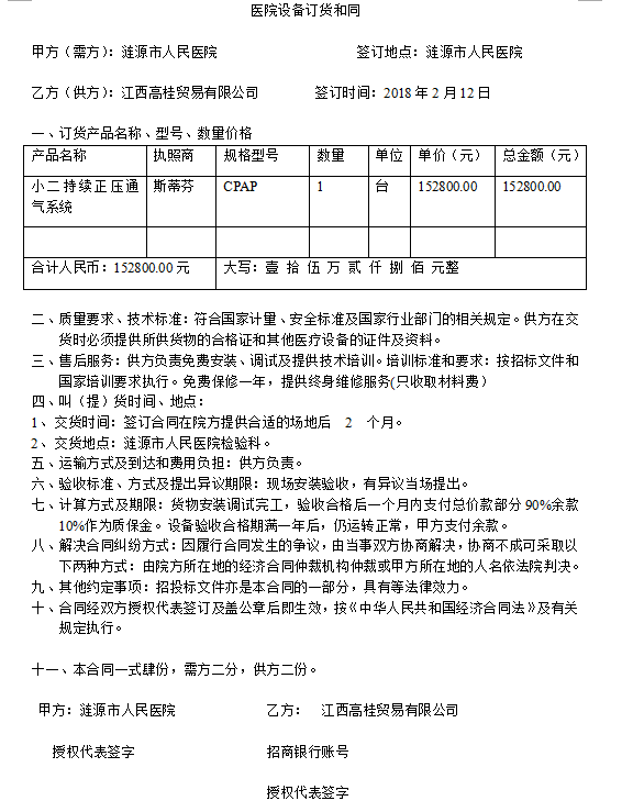 漣源市人民醫院小兒專用無創呼吸機采購合同