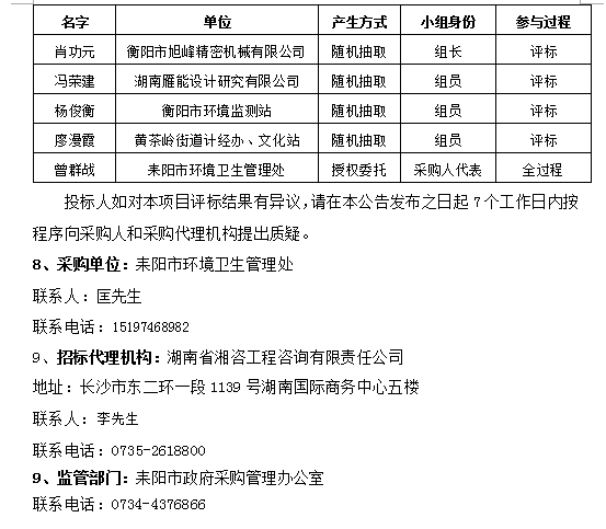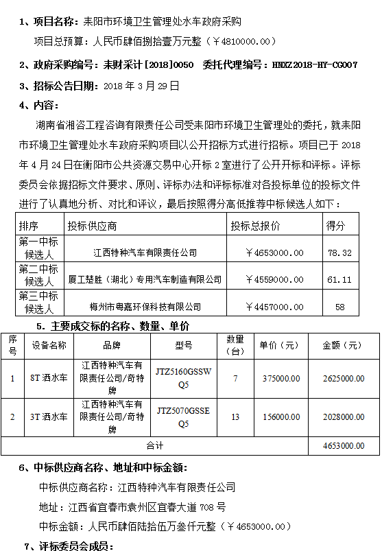 耒陽市環境衛生管理處水車政府采購評標結果公示